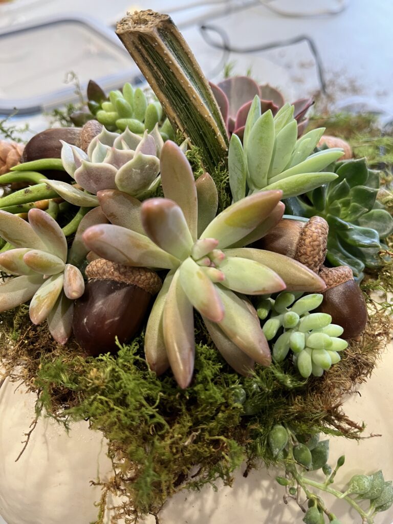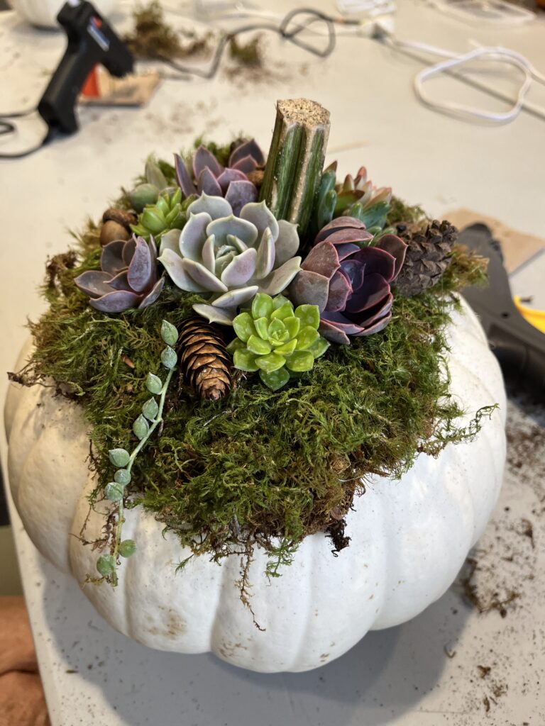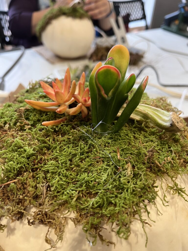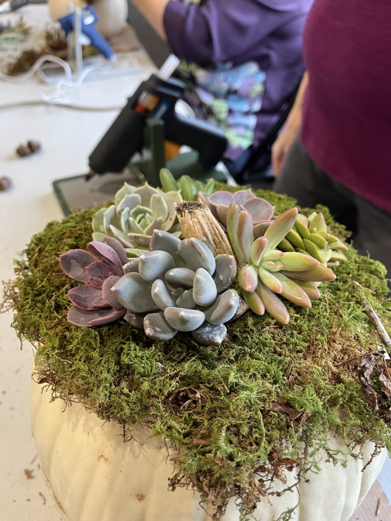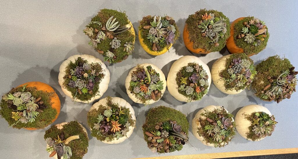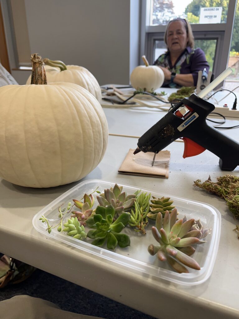 This Tuesday night, a number of us gathered at the Cobourg Public Library for our pumpkin and succulent workshop. It is always fascinating that we all had the same materials, and yet every single pumpkin turned out differently.